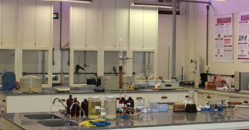 Laboratório equipado com aparelhos e instrumental para realização de experimentos de físico-química.